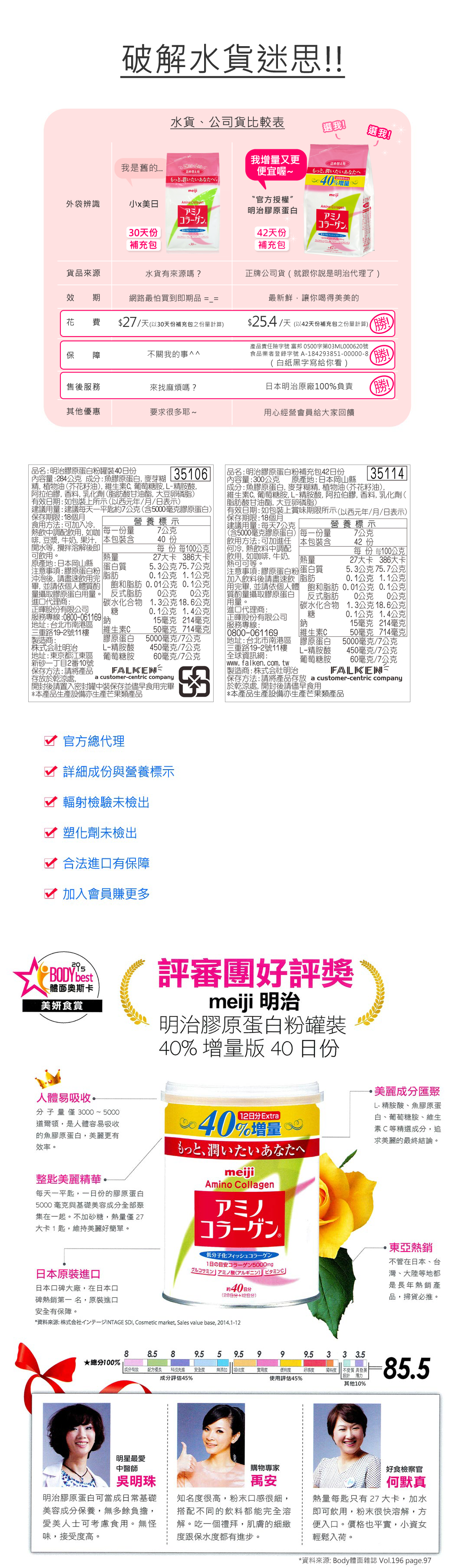 .100%使用低分子化且人體容易吸收的魚膠原蛋白,分子量僅3000~5000道爾敦。